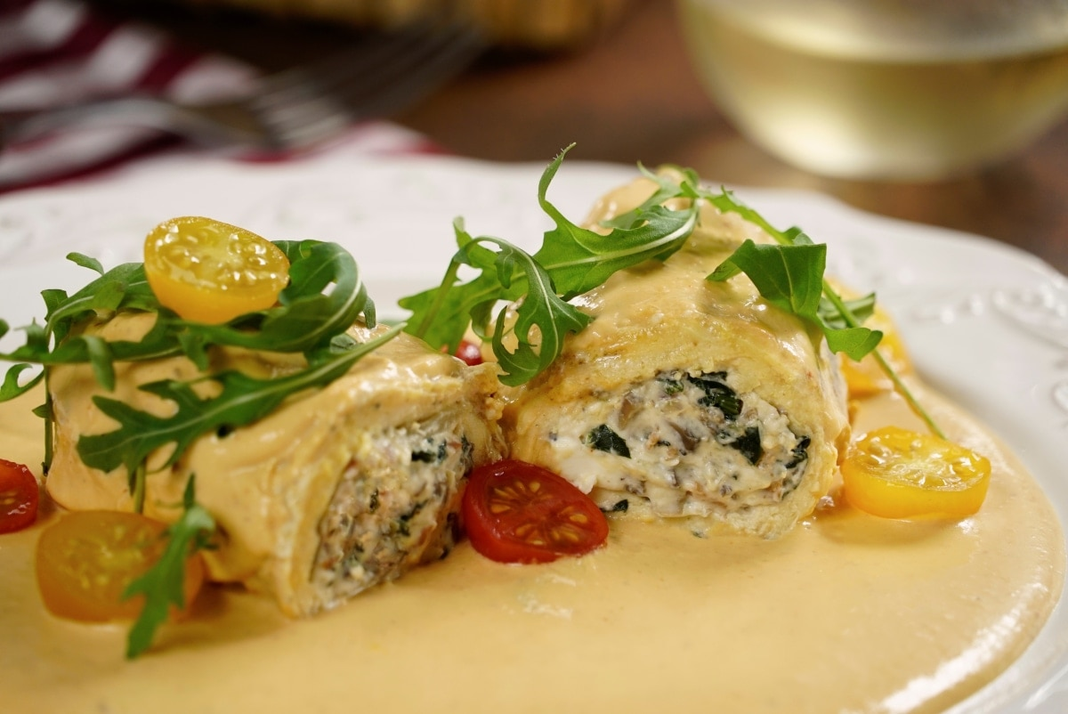 ROLLITO DE PECHUGA DE QUESO Y ESPINACA EN SALSA DE QUESO